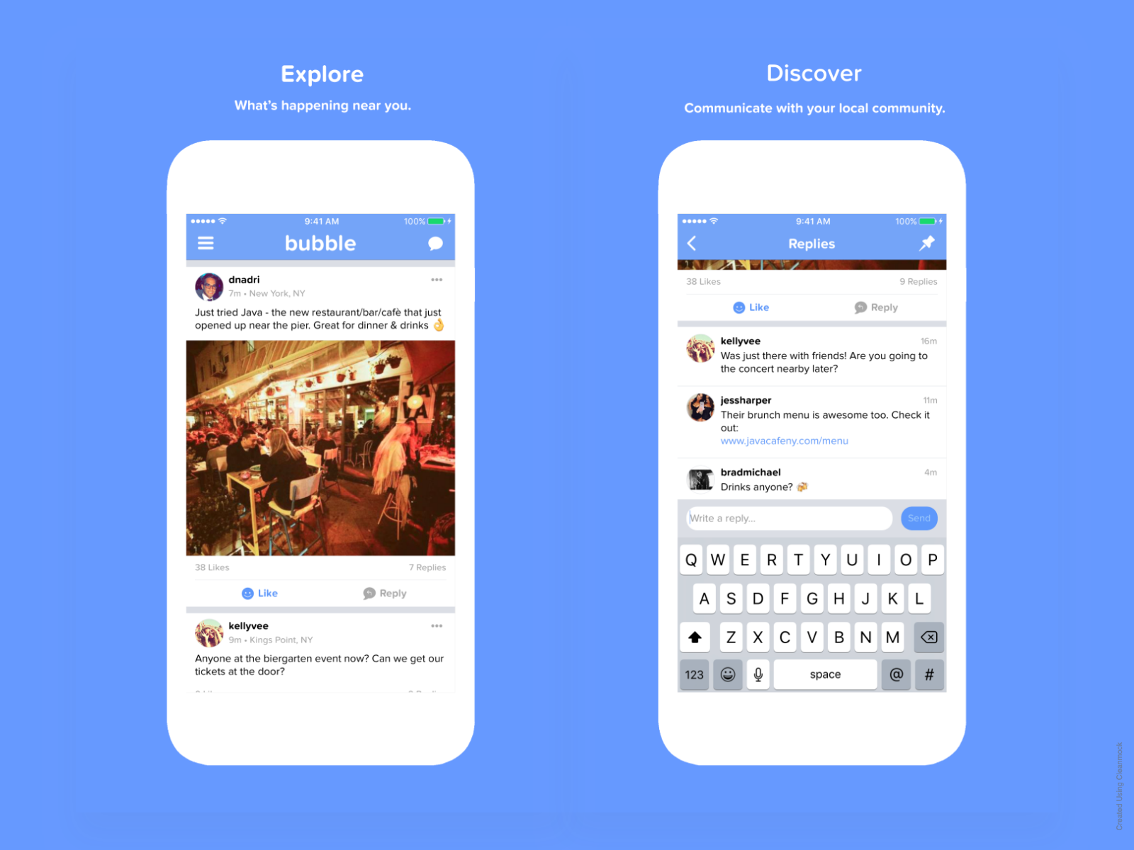 Bubble is a simple location-based social networking app that lets people explore what's happening near them (or as we like to say, in their “bubble”). Discover new places, people, ideas, and more within the local community and share information, photos, links, location and more.